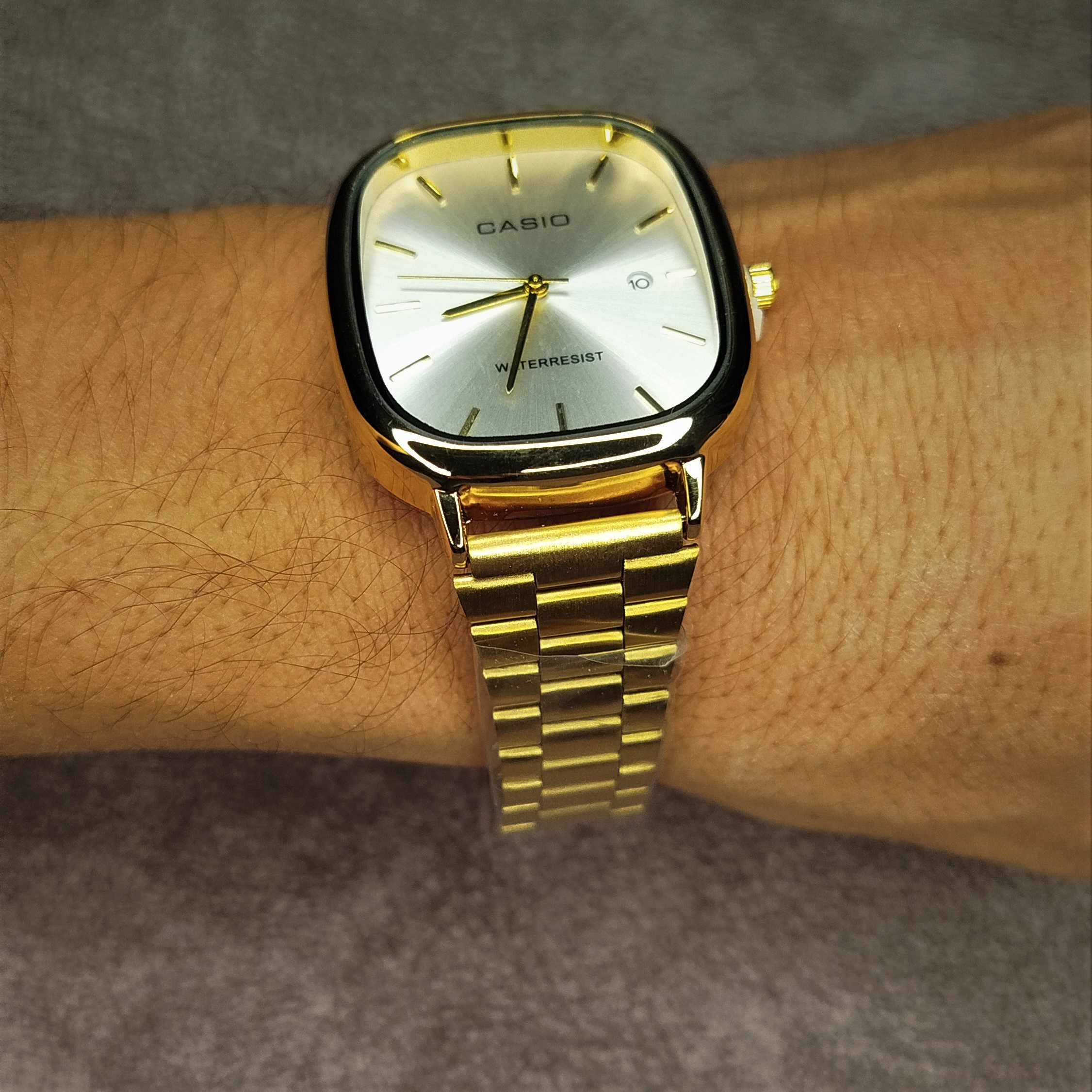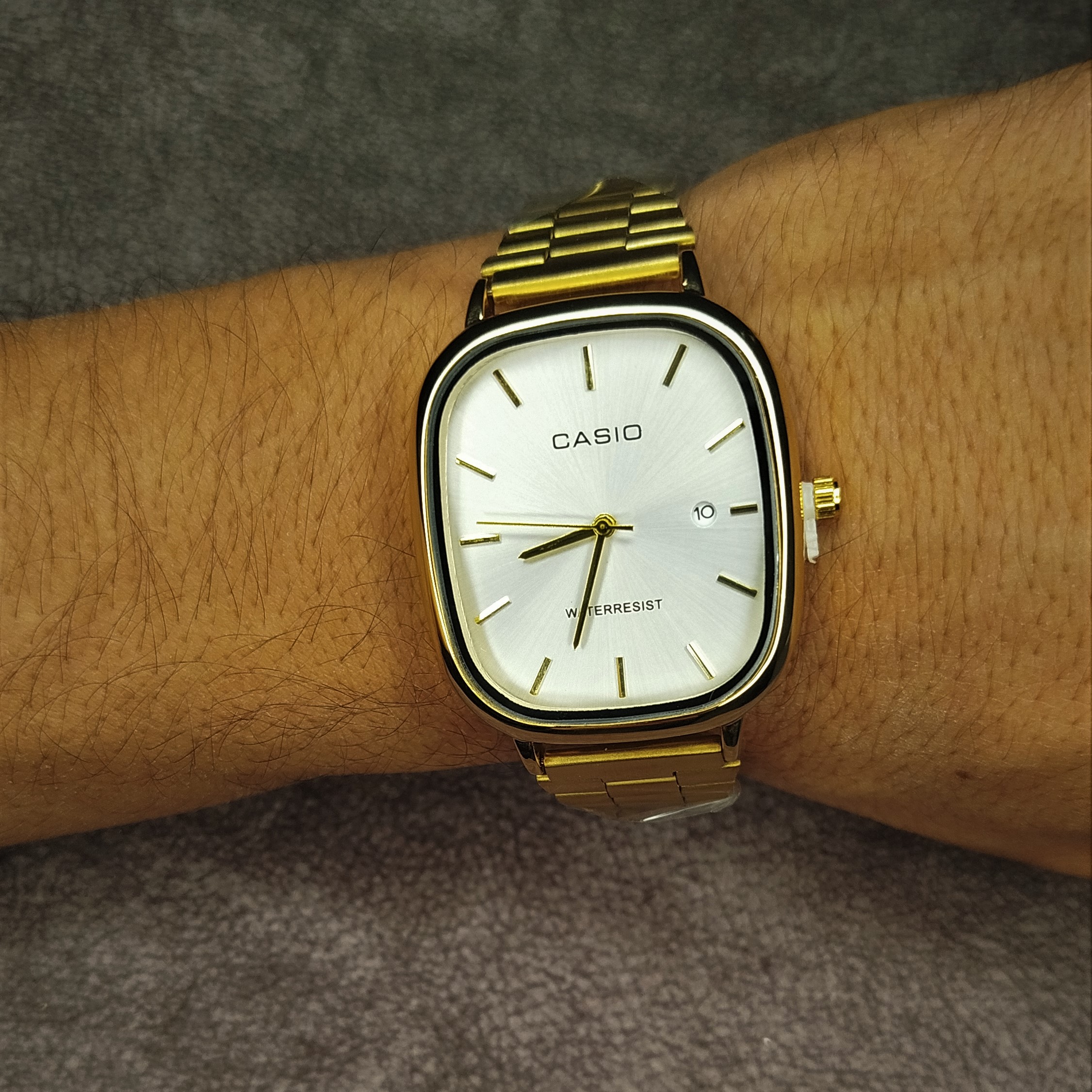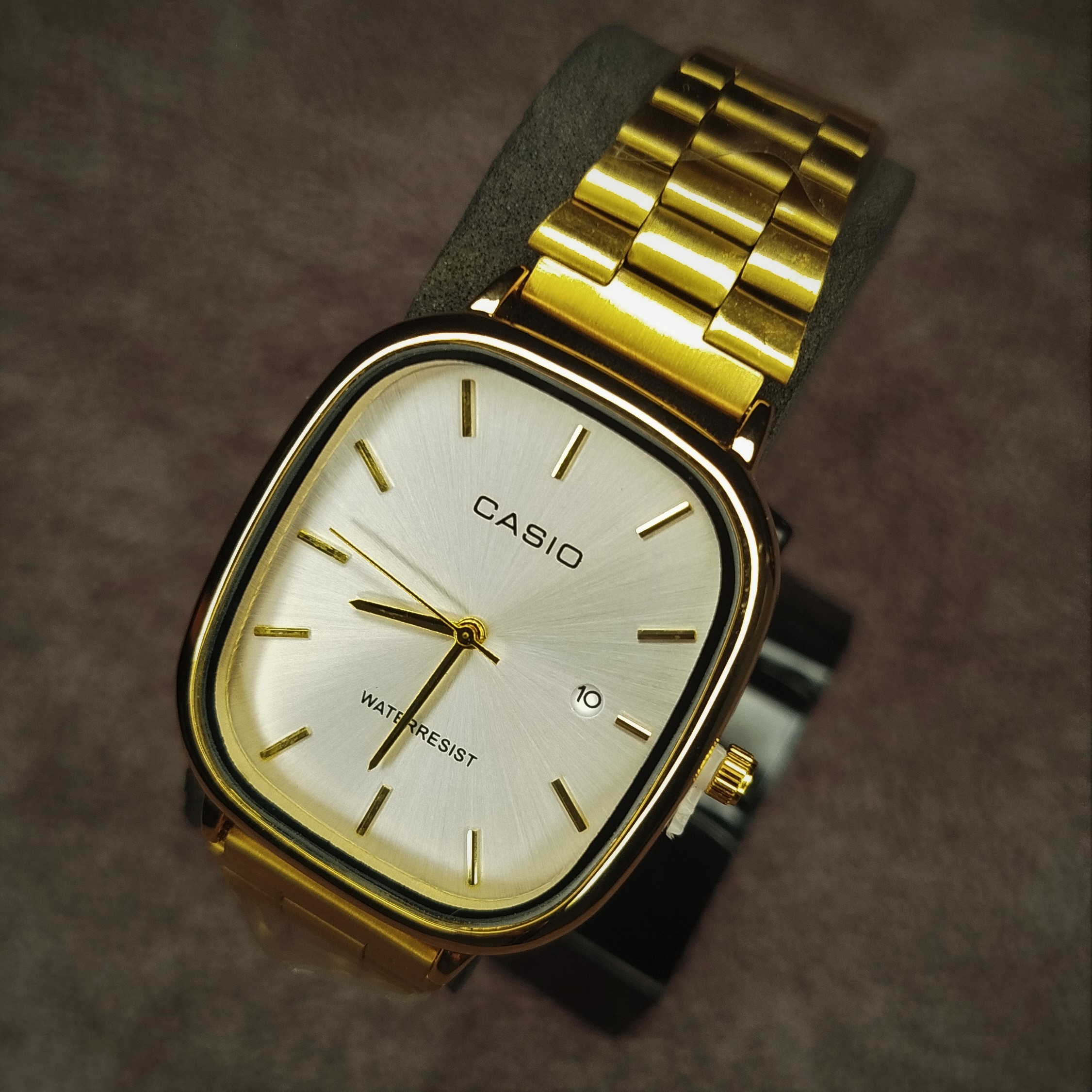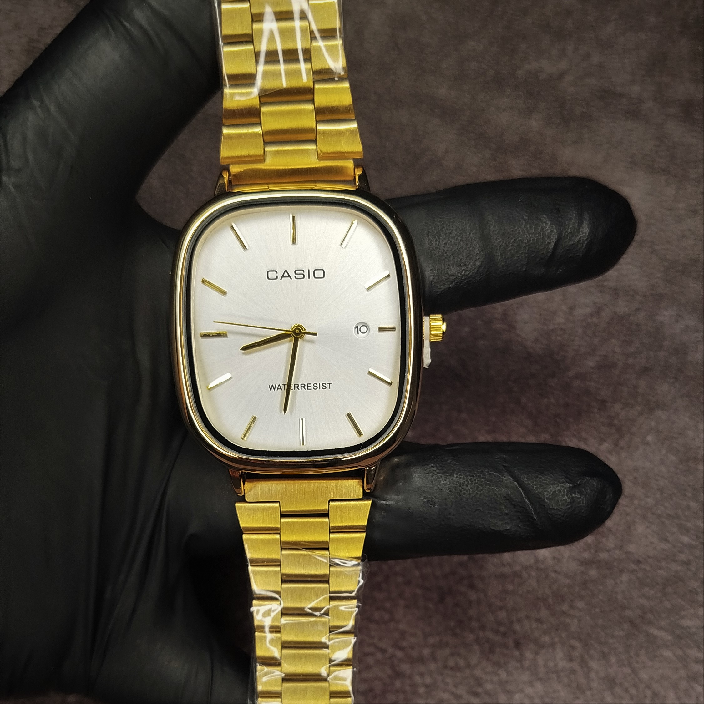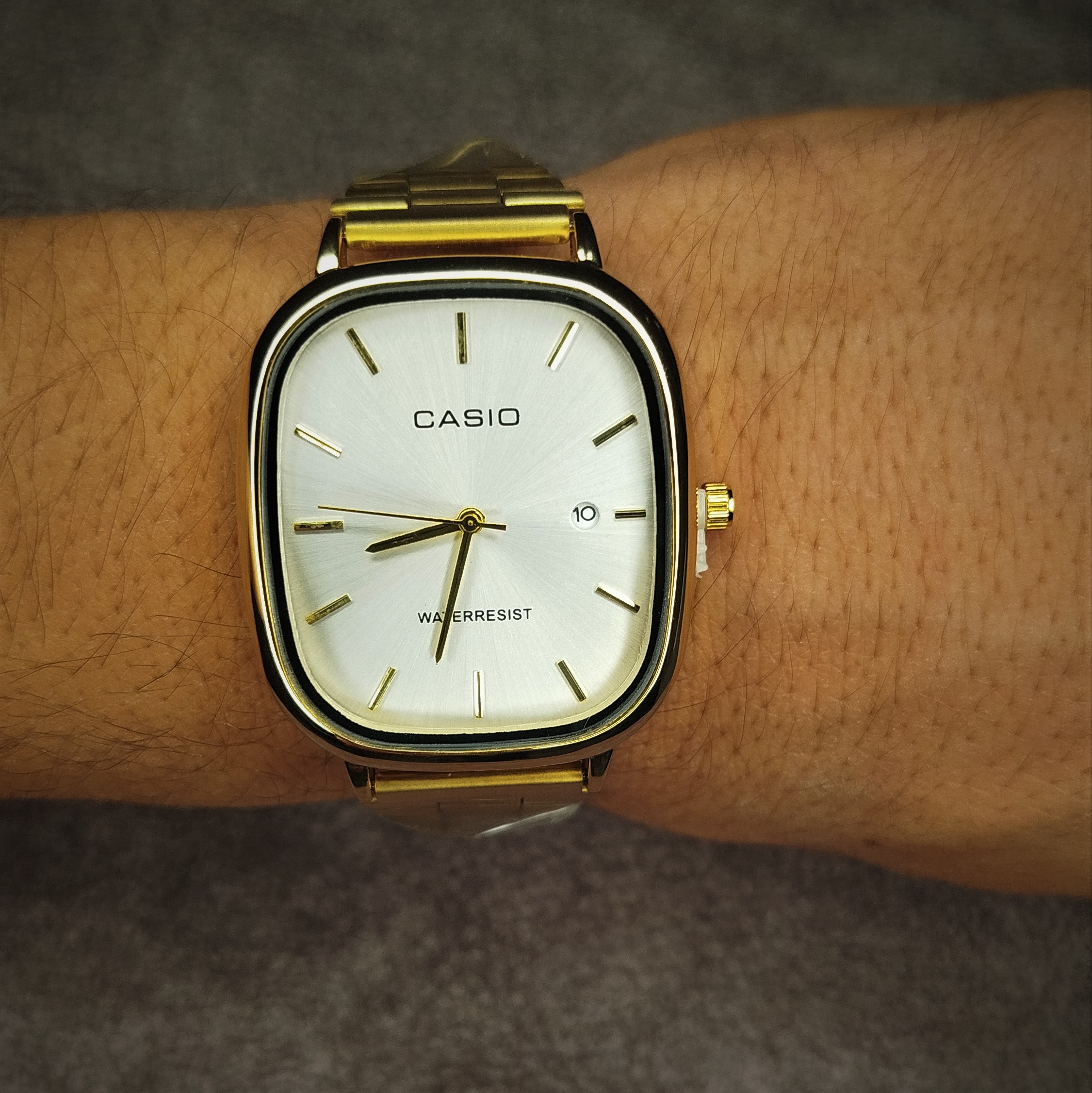 ساعت مچی کاسیو طلایی شش ماه ضمانت بند آسانسوری قابل تنظیم بدون ابزار دارای تقویم فعال ضد آب در حد دست شستن طراحی کلاسیک کیفیت عالی
