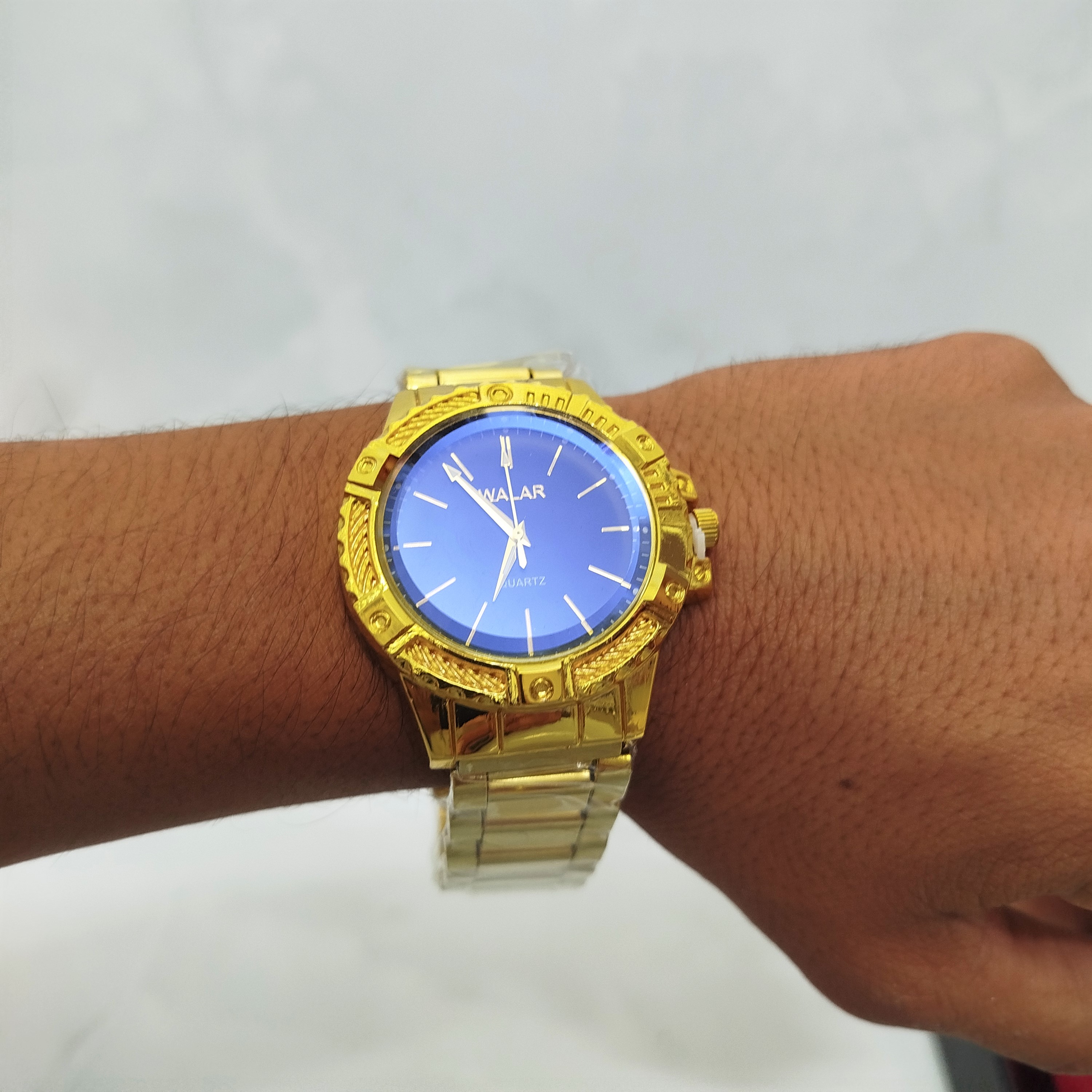 ساعت والار با قاب طلایی طرحدار و صفحه مشکی، ترکیبیست از شکوه کلاسیک و جسارت مدرن. طراحی جزئیات قاب، جلوهای هنری به این مدل بخشیده و آن را به انتخابی خاص برای استایلهای رسمی و روزمره تبدیل کرده است.